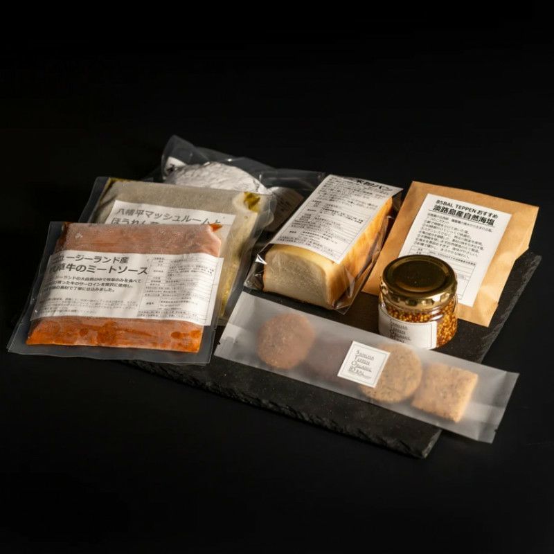 • 内容:自家製ハニーマスタード(50g)、自家製米粉パン(ハーフサイズ)、自家製米粉クッキー(4枚)、85BAL TEPPENおすすめ淡路島産自然海塩(40g)、NZ産牧草牛のミートソース(1人前)、八幡平マッシュルームとほうれん草のサグカレー(ビーガン対応・ 1人前)、スーパーフードハンバーグ(130g)